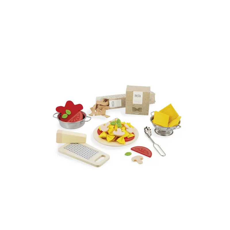 Mamma mia! Questo kit di pasta è perfetto per i piccoli buongustai! I bambini che amano la pasta, si divertono sempre a cucinare e hanno molta fantasia rimarranno estasiati da questo set di pasta! Il set include tutto l'occorrente per immaginare prelibati piatti di pasta, all'italiana o alla francese, che saranno apprezzati da tutti. Per creare le loro specialità, i bambini dai 3 anni in su potranno utilizzare i numerosi accessori inclusi: 20 farfalle incredibilmente verosimili, 4 grandi ravioli, 6 foglie di basilico, 5 funghi e 1 salsa di pomodoro, tutti in feltro. Le 10 tagliatelle sono formate con un nastro piatto che imita perfettamente il colore di questa ottima pasta! E per guarnire i piatti dei piccoli chef, non c'è niente di meglio del parmigiano con grattugia e dei pomodori di legno. Il cucchiaio, lo scolapasta, la pentola in metallo e il piatto inclusi permettono di servire la pasta in modo realistico. I due pratici pacchetti in cartone permettono di conservare la pasta per non perderla. Questo giocattolo di imitazione è perfetto come accessorio delle cucine per bambini. Stimola l'immaginazione e i momenti di condivisione in famiglia e con gli amici. Questo prodotto è realizzato con materiali certificati FSC® e materiali controllati.