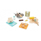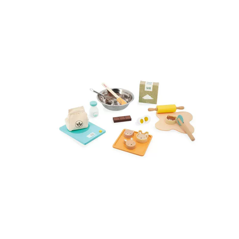 Mmm, che magnifico odorino proviene dalla mini cucina dei bambini! Con questo set di accessori in legno da pasticceria, i piccoli golosi che amano cucinare i dolci potranno imitare i grandi in modo realistico! Questo set contiene tutto l'occorrente per dare libero sfogo alla creatività e all'immaginazione dei piccoli pasticceri in erba! Primo passo della ricetta: pesare gli ingredienti con la graziosa bilancia in legno. Questo kit da pasticceria include una confezione di zucchero in cartone, un sacchetto di farina in stoffa, una bottiglia di latte in legno, un uovo con chiusura a strappo e una barretta di cioccolato. Spetta ai bambini combinarli secondo i loro desideri! Quindi sarà necessario mescolare gli ingredienti nella ciotola con la frusta in metallo e stendere il magnifico impasto in feltro con il mattarello facile da afferrare per le mani dei più piccoli. E la spatola permetterà di non lasciare alcun residuo nella ciotola! Quale forma darai alla pasta frolla? Perché non preparare piccoli bigné con la rotella dentellata? I due coppapasta 2 stampini in silicone a forma di testa di orso e di coniglio permettono di realizzare 4 pasticcini tenerissimi!