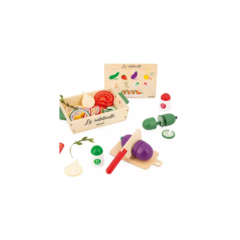 Stasera si mangia una deliziosa ratatouille! I piccoli chef dai 3 anni in su prepareranno un piatto variopinto con questo set di accessori da cucina in legno e feltro. Come si fa? È facilissimo, basta seguire la ricetta illustrata inclusa! E non è tutto, sono inclusi ben 32 accessori in per ricreare questo celebre piatto mediterraneo: 1 zucchina in legno da tagliare in 5 fette, 1 melanzana in legno da tagliare in 5 fette, 4 fette di pomodoro in legno, 2 fette di cipolla in legno, 5 fette di peperone in feltro, 3 steli di erbe aromatiche in feltro, 1 saliera e 1 pepiera in legno, 1 coltello in legno, 1 tagliere in cartone e 1 teglia in legno.