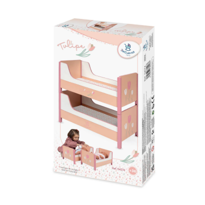 Include: 1 letto a castello in legno per bambole serigrafato con design speciale della collezione Tulipe, convertibile in due lettini, due materassi con design speciale abbinato e molti altri dettagli di lusso.