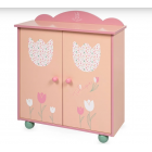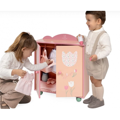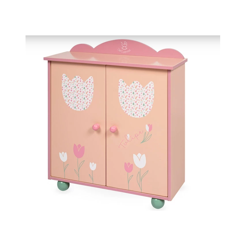 Include: 1 armadio in legno per bambole con serigrafia del design speciale della linea Tulipe rosa, due porte a battente, tre grucce in legno e tanti altri dettagli di lusso.