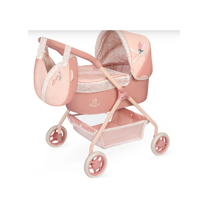Tulipe. Include: 1 passeggino My First Doll della collezione Tulipe in rosa con una speciale stampa a tulipani, borsa coordinata, vassoio portaoggetti in tessuto, materasso, ruote rivestite in schiuma, dettagli ricamati, capottina con tasche laterali, copertina con una piccola tasca e molti altri dettagli di lusso.