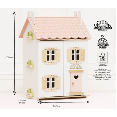 Realizzata in legno sostenibile certificato FSC®, questa casa delle bambole resistente e di alta qualità presenta un tetto smerlato, porte e persiane apribili e chiudibili per un gioco realistico, oltre a un ingegnoso tetto sollevabile che rivela l'accesso a una graziosa camera da letto mansardata.