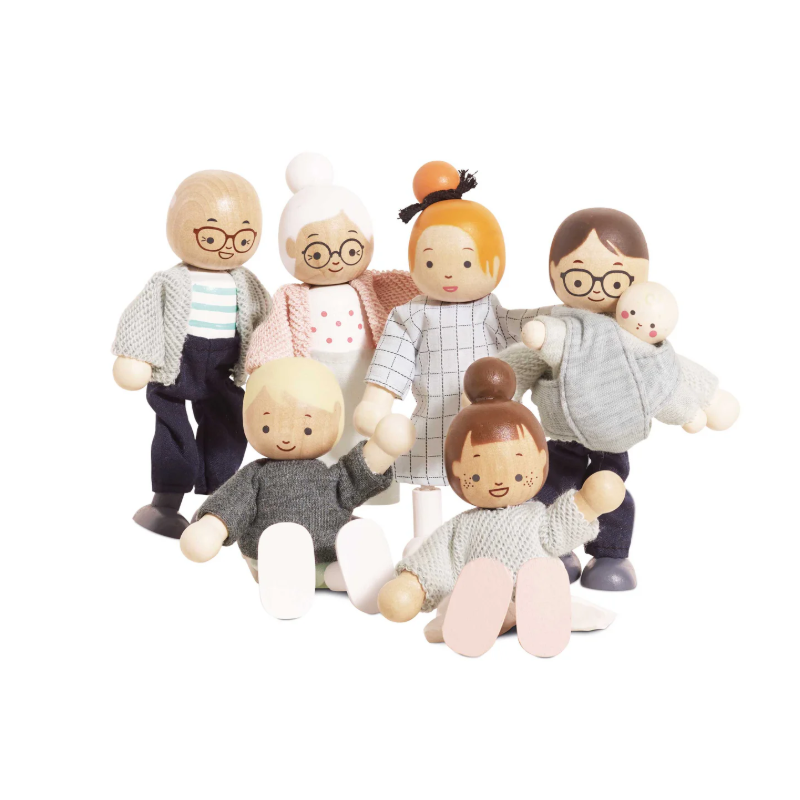 Questa adorabile famigliola di bambole è pronta a trasferirsi nella sua nuova casa da sogno. Composto da 7 personaggi altamente dettagliati e snodabili, questo set comprende genitori, nonni, bambini e un neonato, completo di marsupio porta-bebè. Realizzato in legno sostenibile certificato FSC® e vestito con splendidi abiti rifiniti a mano, è pronto per essere accolto nel quartiere. Doll House People è compatibile con la nostra gamma completa di bellissime case delle bambole in legno e accessori.