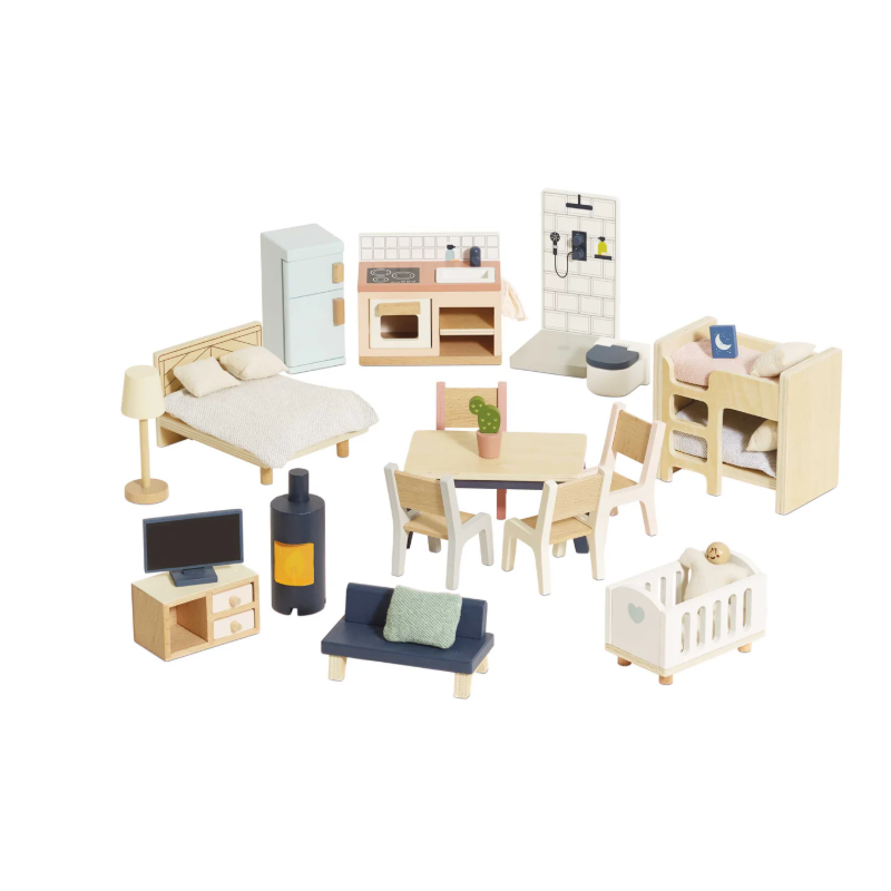Composto da 37 pezzi, perfettamente in scala con tutte le nostre case delle bambole Le Toy Van. Include letti a castello per bambini con scaletta, comodino, casa delle bambole in miniatura, culla, cucina completa, fornello, tavolo e sedie, cassettiera e molto altro. Gli articoli sono come in foto.