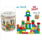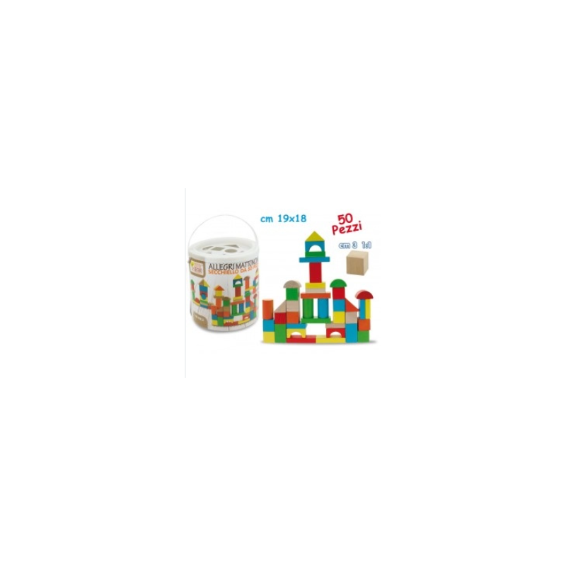 Fantastico secchiello con 50 pezzi di mattoncini di legno , di tutte le forme e i colori!